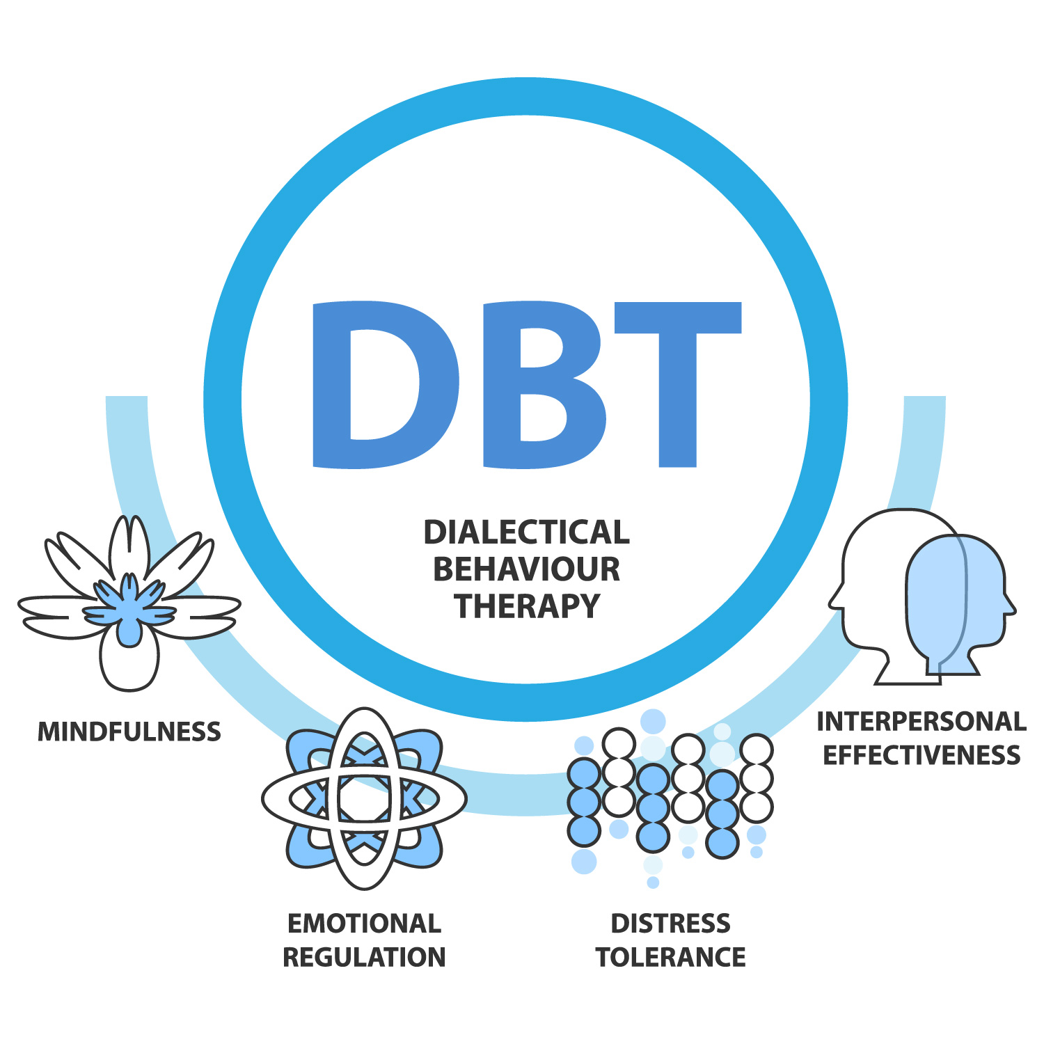 Dialectical Behaviour Therapy (DBT) integrates cognitive-behavioural strategies with mindfulness and acceptance practices. It focuses on helping individuals understand and manage intense emotions, reduce self-destructive behaviours, and improve relationships. The term dialectical reflects the balance between acceptance and change, acknowledging one’s experiences while actively working toward growth. In therapy, clients learn skills across four main areas: mindfulness, emotion regulation, distress tolerance, and interpersonal skills. This structured, skills-based model emphasizes real-world application and encourages ongoing practice between sessions to build emotional resilience and stability.